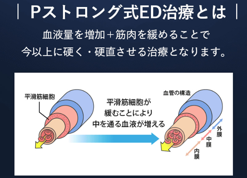 つまりPストロング(P-strong)は「その場限り」ではなく、中長期的に勃起力にアプローチする治療といえますね。