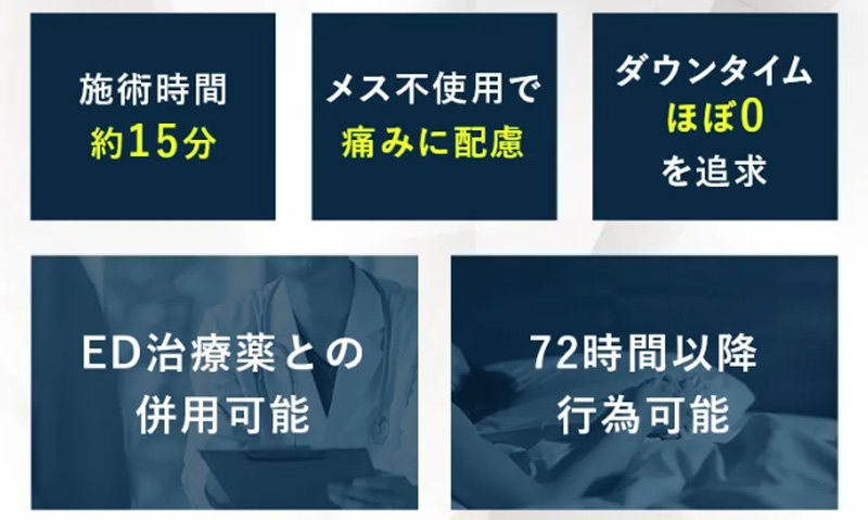 その点Pストロング(P-strong)は施術時間が約15分・切開不要・通院不要・ダウンタイムほぼゼロと、他の治療法に比べて圧倒的に負担が少ないのが魅力。