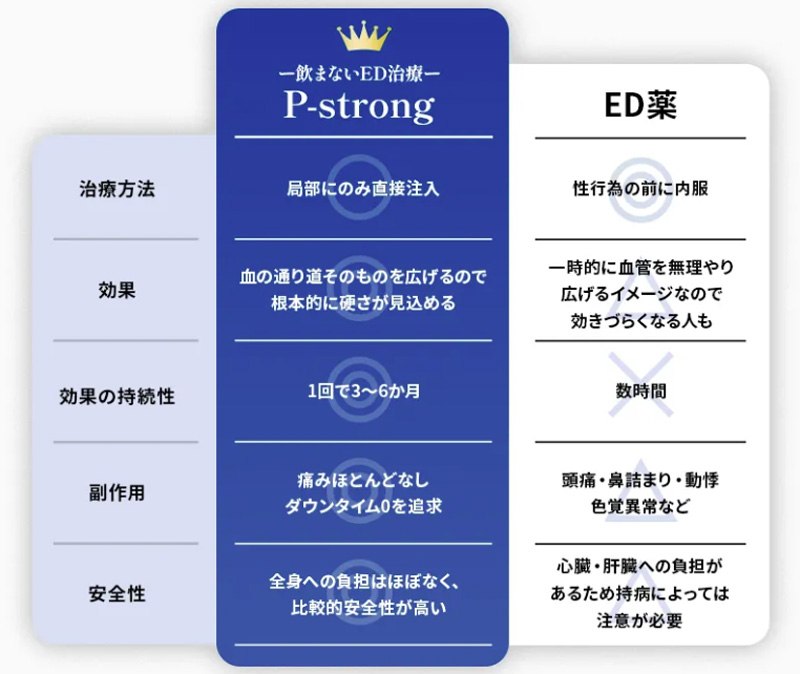 そんな方こそ、Pストロング(P-strong)のような「飲まないED治療」が選ばれる理由があります。