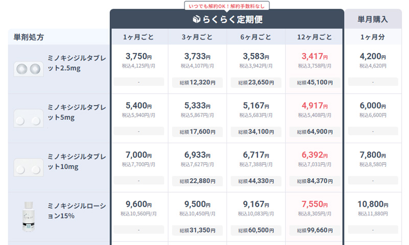 ミノキシジルタブレット2.5mg | 4,620円 | 4,125円 | 12,320円 4,107円/月 |